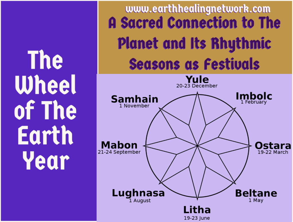 In northern hemisphere we celebrate the start of Summer and in the Southern hemisphere the reverse applies and summer ends. These are the true Earth festivals that we all must celebrate. There are eight Sabbats per annum, reversed in the Southern hemisphere. These are illustrated below.