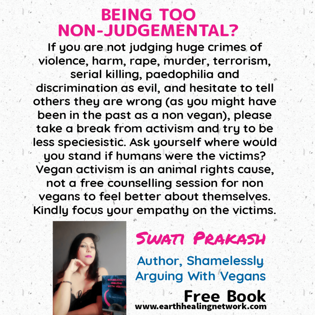 If you claim to be a vegan and preach non judgemental attitudes towards huge crimes perpetrated against animals of other species, shame on you. Blame and shame are healthy for the sake of insight and self reflection. They help us awaken.